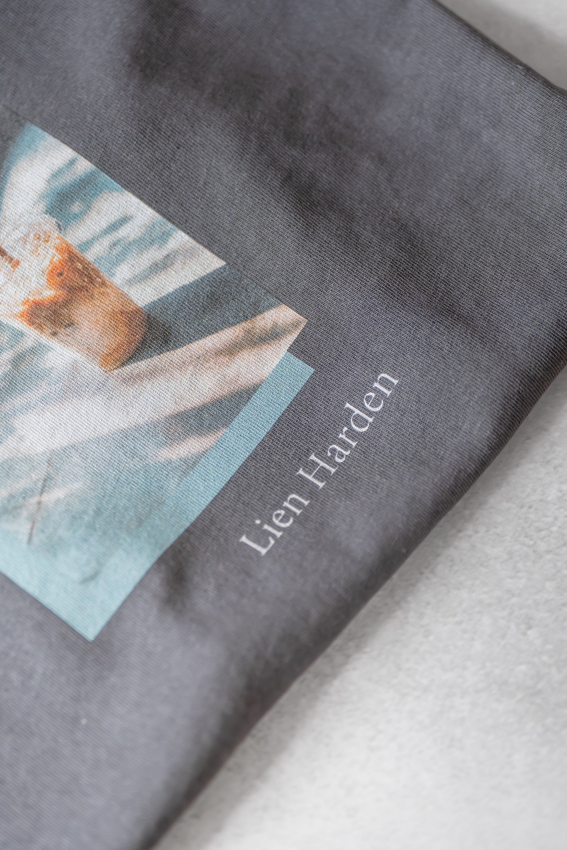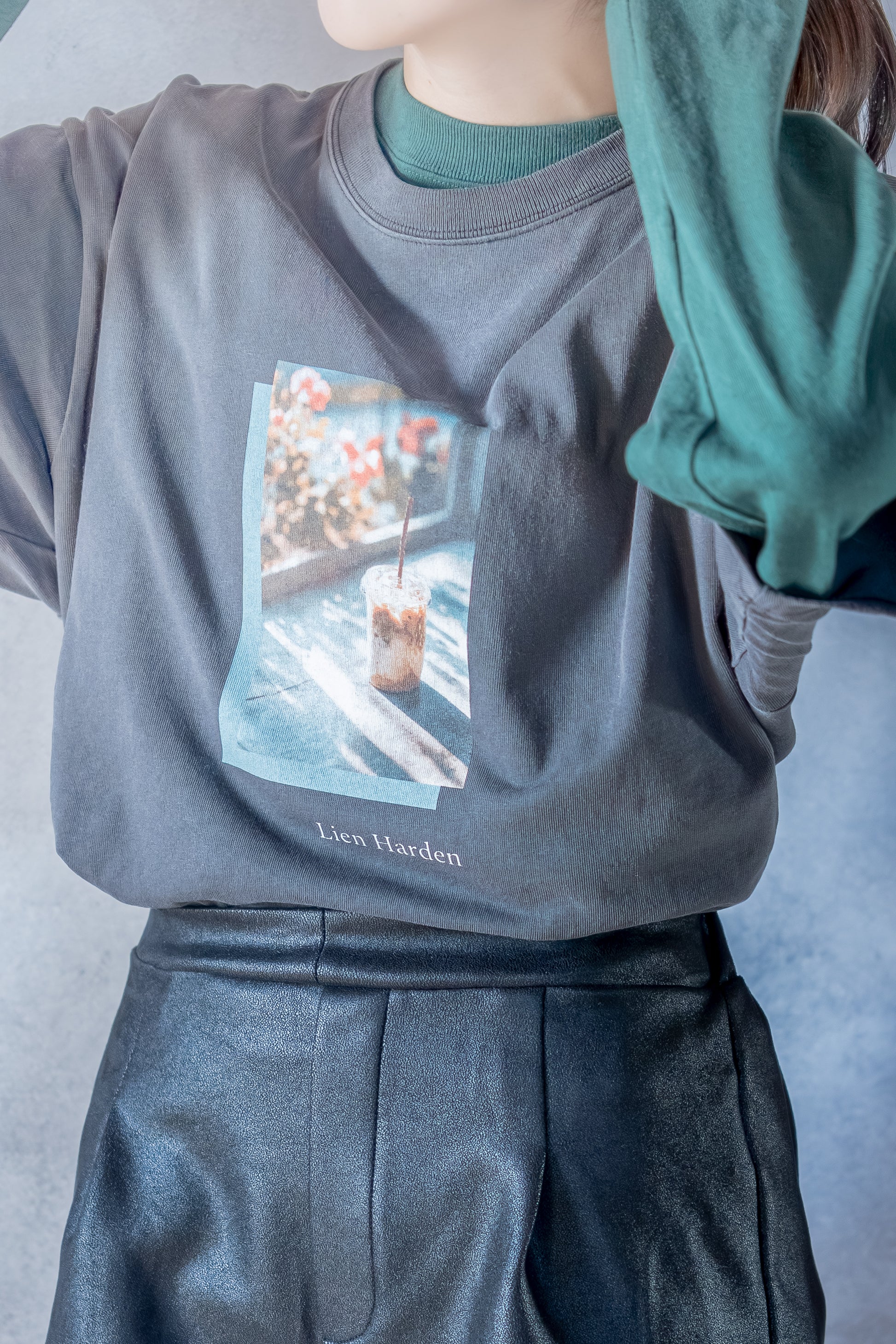 ピグメント染めのスモーキーな黒が、写真のやわらかいブルーをほどよく締め、