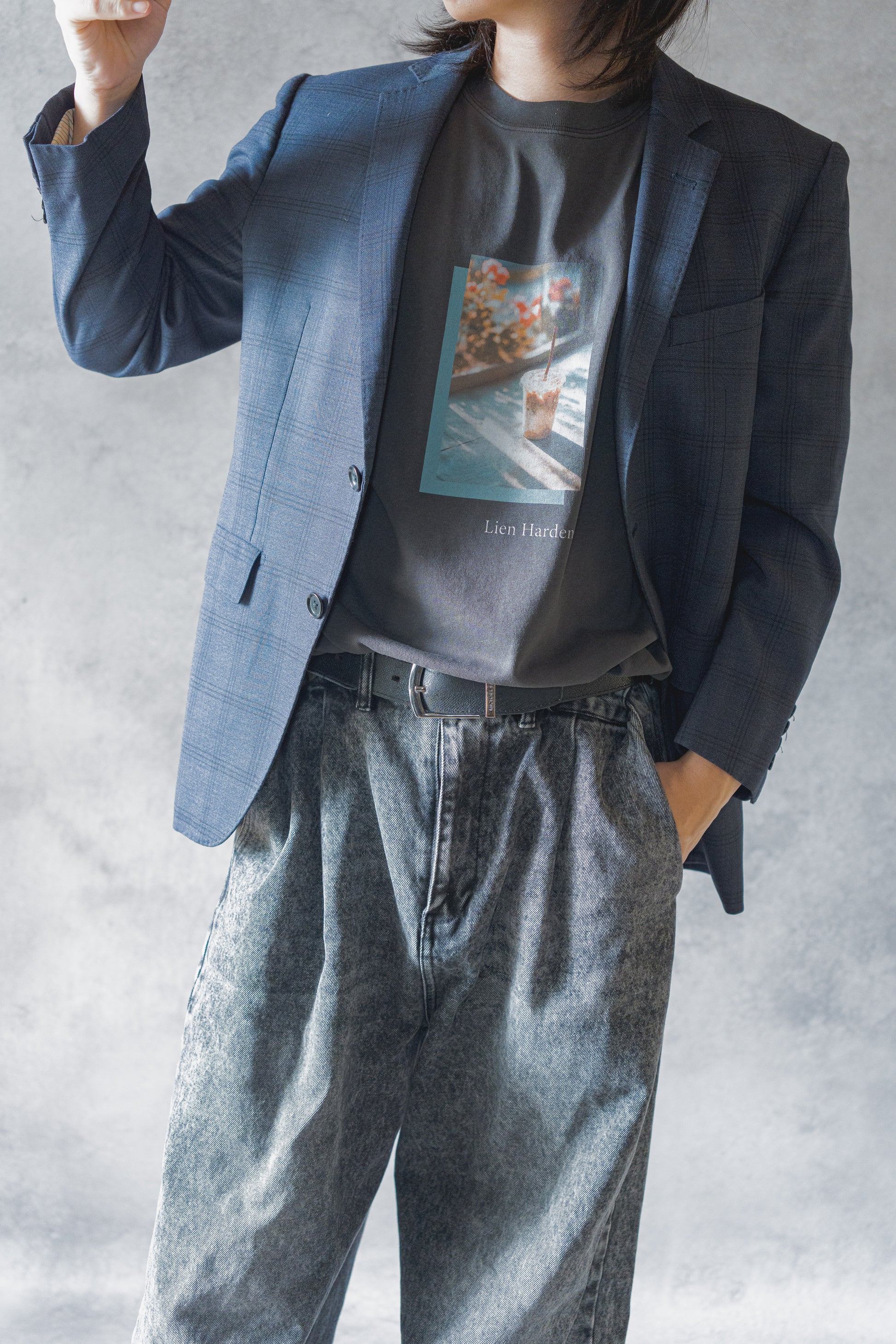 “デニムにもジャケットにも合う、静かな存在感のアートT。”